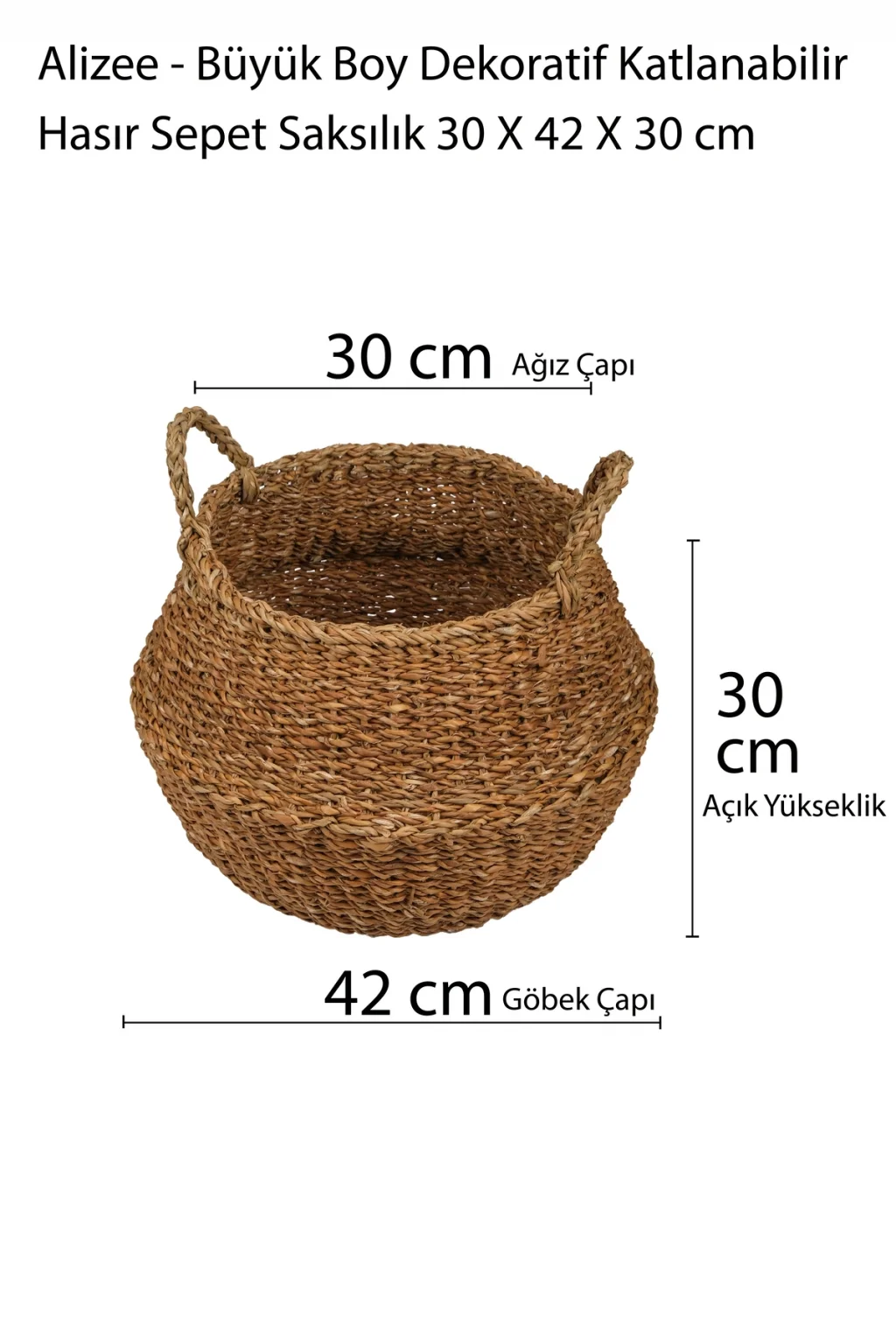 Alizee - Büyük Boy Dekoratif Katlanabilir Hasır Sepet Saksılık ; Alizee Büyük Boy saksı sepet ile yaşam alanınıza ayrı bir hava katın.; ; Doğal görünümüyle ortama sıcaklık katar.; ; Doğal bir ürün olduğundan hafif nemli bir bezle silerek temizleyebilirsiniz.; ; El örmesi olması sebebiyle ebatlarında 1 cm santim kadar oynama olabilmektedir.; ; Ürünün ölçüleri dıştan dışa ölçüler olup içine koyacağınız saksı ölçerken sepetin yaklaşık 1 cm hasır kalınlığını da dikkate almalısınız .; ; Paket içeriği: 1 Adet Büyük Boy Saksı Sepeti ; Materyal: %100 Doğal Hasır ; Ebatlar: Ağız Çap:30 cm Göbek Çapı: 42 Yükseklik:30 cm ; Koşulları: Ürünlerinizin tarafınıza ulaştığı şekilde patpata sarılı, kutulu ve ambalajı bozulmamış olarak edilmesi gerekmektedir.; Aksi halde gönderilen iadeler kabul edilemeyecektir.