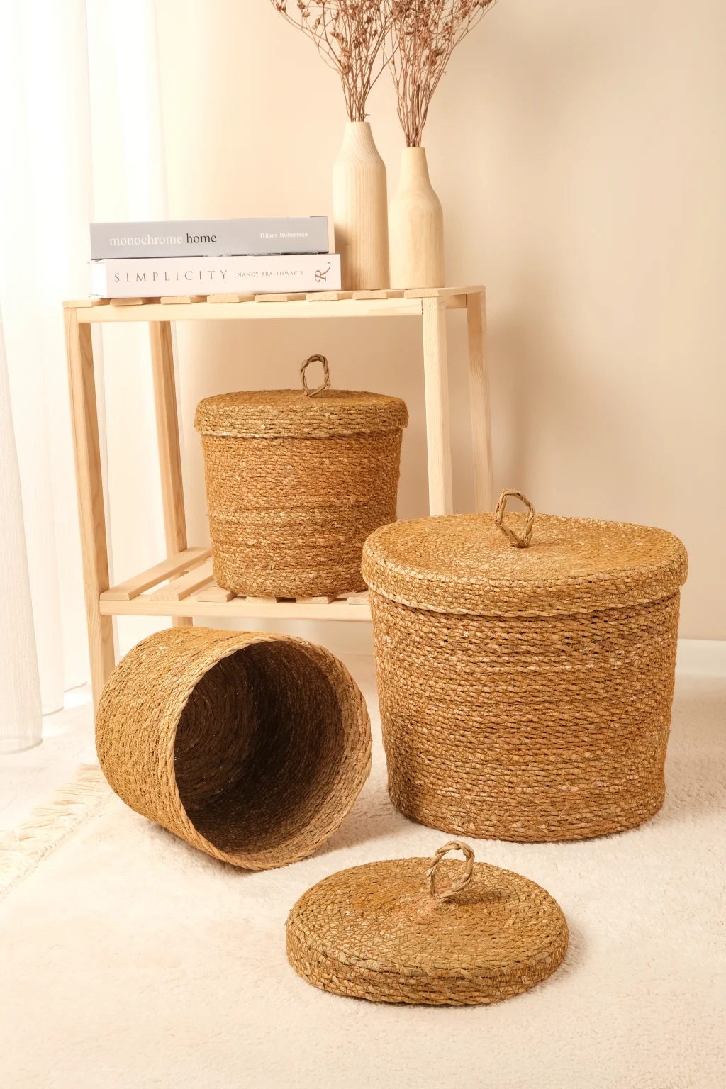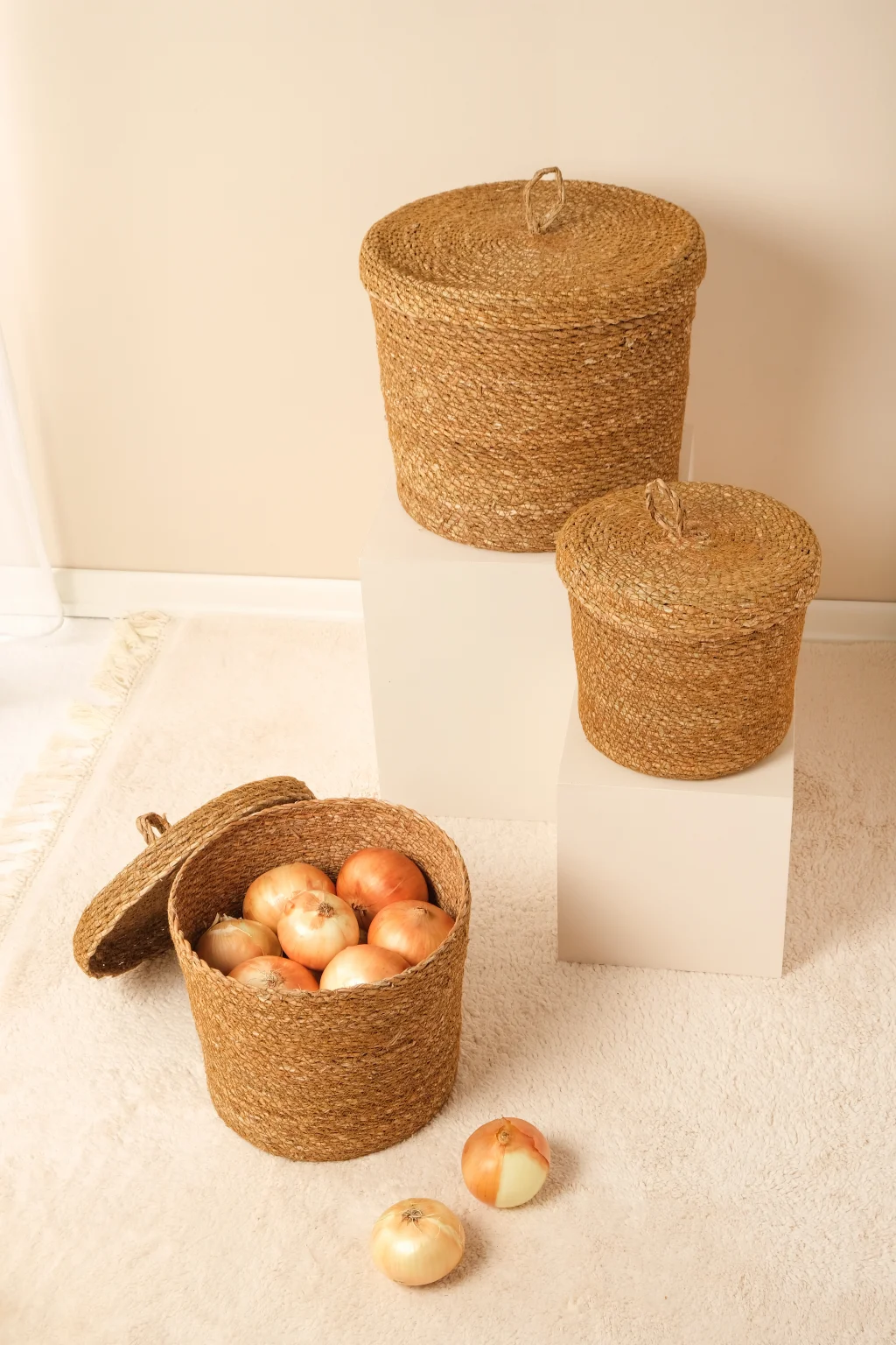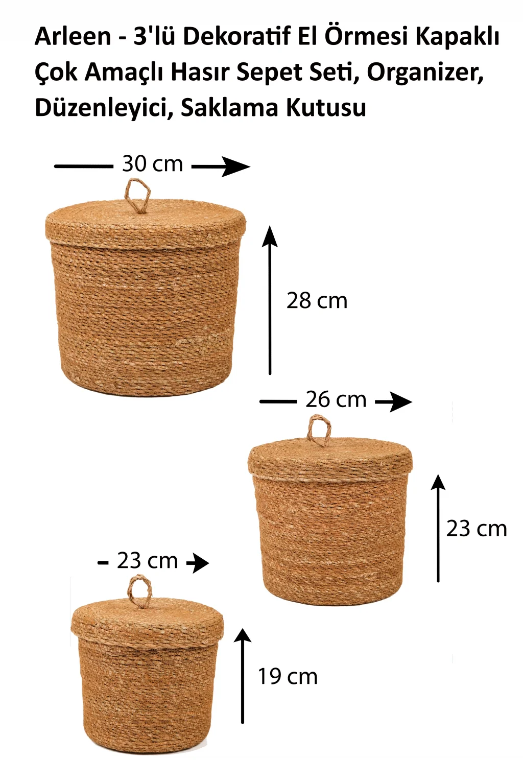 Arleen - 3'lü Dekoratif El Örmesi Kapaklı Hasır Sepet Seti, Organizer, Düzenleyici, Saklama Kutusu ; Doğal Hasır Örme Hasır Kapaklı Kutu Sepet Seti. ; Şık Tasarımı İle Evinizin Her Köşesinde Kullanıma Hazır. ; %100 Doğal Hasırdan Üretilmiştir. ; Çok Amaçlı Düzenleyici olarak kullanabilirsiniz tercihinize göre (Organizer, Düzenleyici, Saklama Kutusu, Çeyiz Kutusu v.b.) ; Materyal: Doğal Örme Hasır ; Ebatlar: ; Büyük Çapı: 30 cm Yükseklik: 26 cm Hacim: 15 lt ; Orta Çapı: 25 cm Yükseklik: 23 cm Hacim: 10 lt ; Küçük Çapı: 22 cm Yükseklik: 19 cm Hacim: 6 lt ; İade Koşulları:Ürünlerinizin tarafınıza ulaştığı şekilde patpata sarılı, kutulu ve ambalajı bozulmamış olarak iade edilmesi gerekmektedir. Aksi halde gönderilen iadeler kabul edilemeyecektir. ;