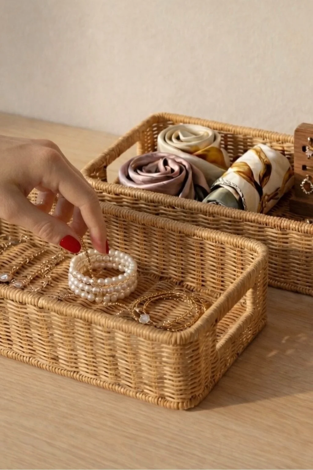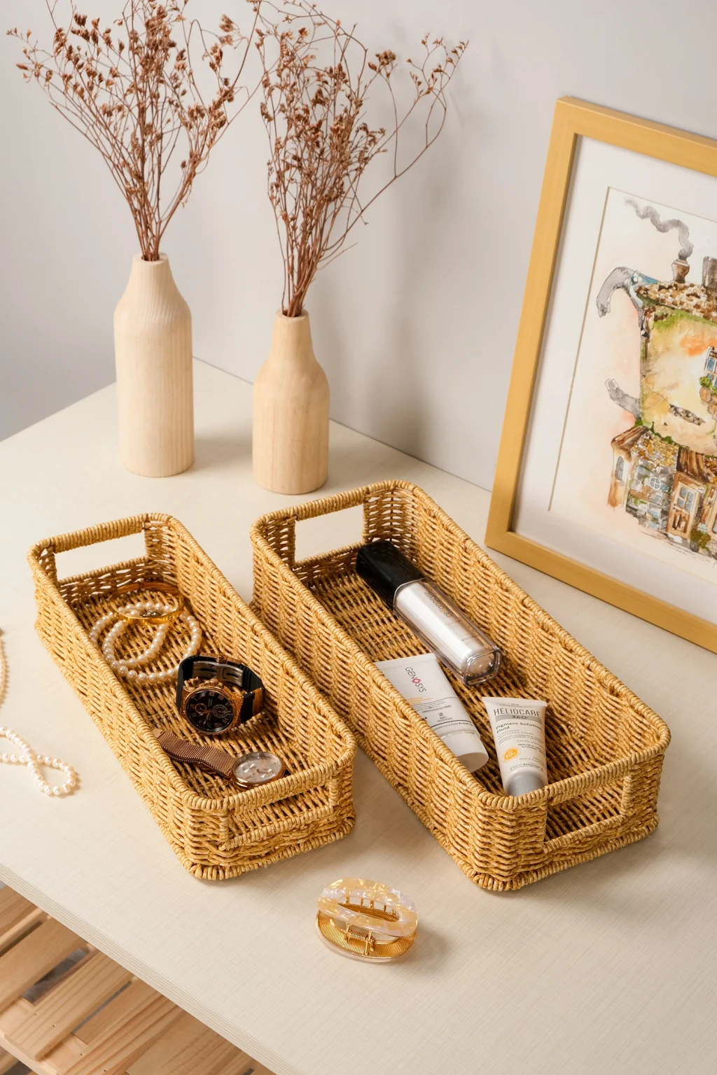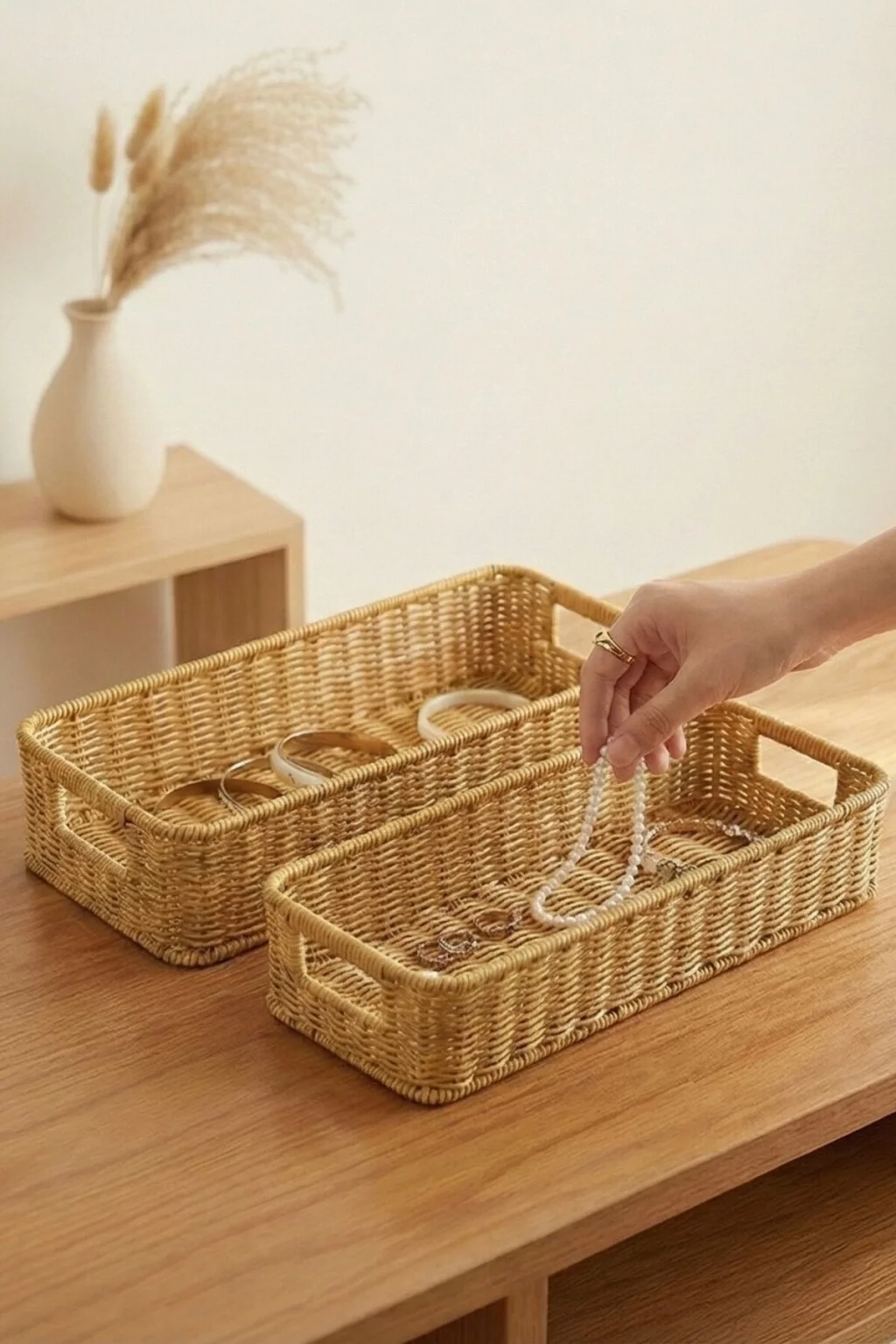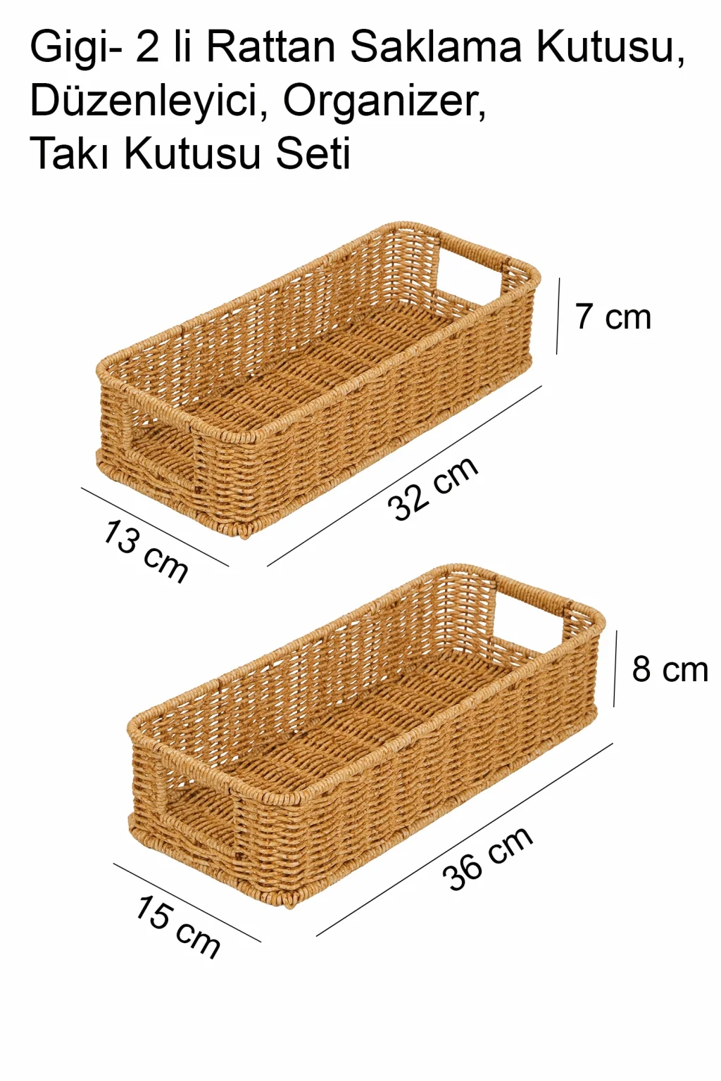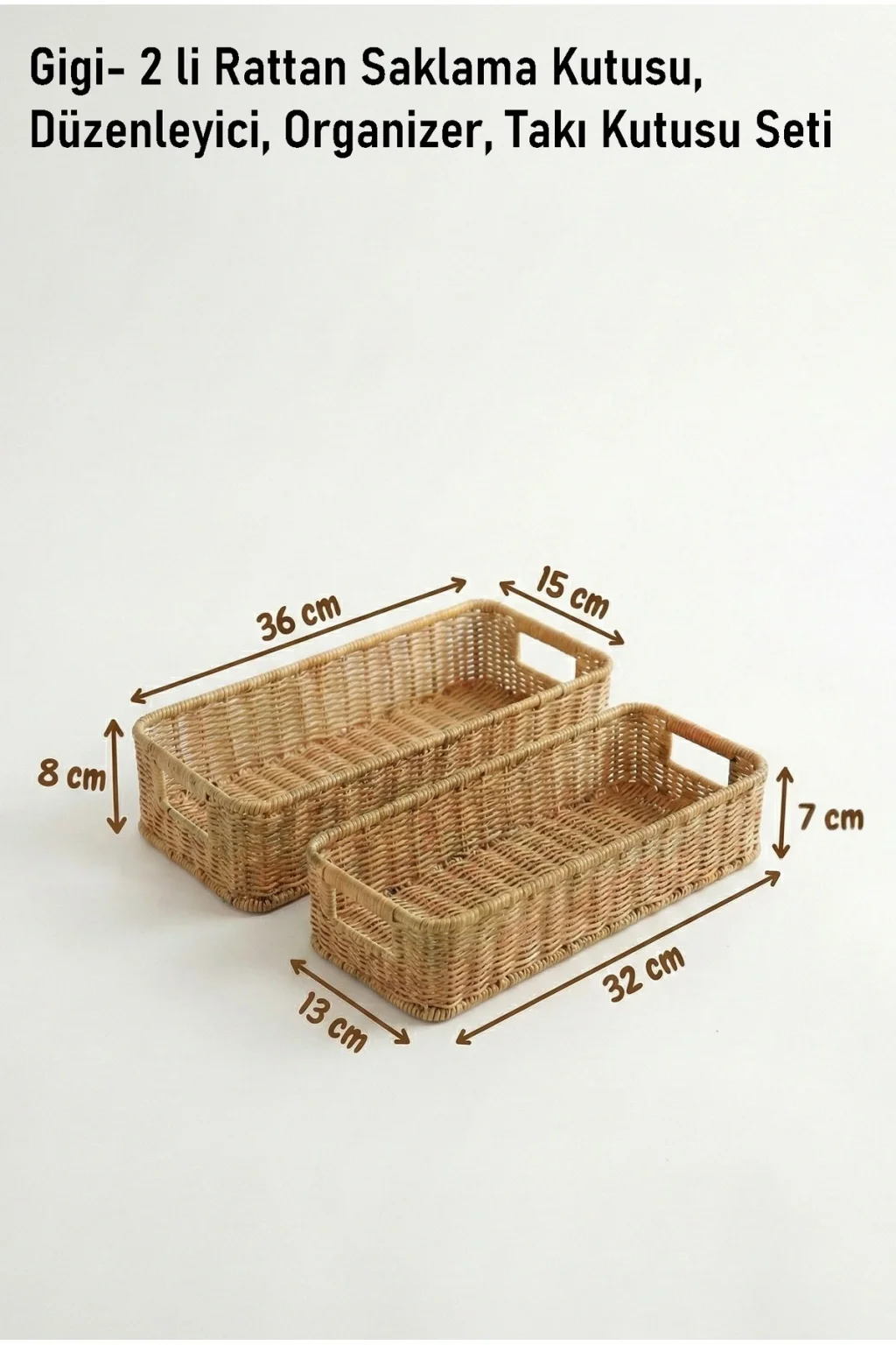 Gigi- 2 li Rattan Saklama Kutusu,Düzenleyici, Organizer, Takı Kutusu Seti ; Modern görünümüyle dekoratif olmasının yanı sıra, makyaj malzemelerinden ofis kırtasiye ürünlerine kadar geniş yelpazede ürünleri saklayabilmek için kullanılabilir.; ; Ev ve ofiste, düzenli alan oluşturmanıza yardımcı olurken, aynı zamanda hasır görünümlü yapısıyla bulunduğu ortama şıklık katar.; ; Küçük eşyalarınız için pratik bir kullanım sağlar ve mükemmel bir saklama çözümüdür.; ; Peket İçeriği: 2 Bot Rattan Organizer ; Materyal : Rattan Plastik ; Ebatlar ; Büyük ; En: 36 cm , Boy: 15 cm, Yükseklik: 8 cm ; Küçük ; En: 32 cm , Boy: 13 cm, Yükseklik: 7 cm ; Koşulları: Ürünlerinizin tarafınıza ulaştığı şekilde patpata sarılı, kutulu ve ambalajı bozulmamış olarak edilmesi gerekmektedir.; Aksi halde gönderilen iadeler kabul edilemeyecektir.;