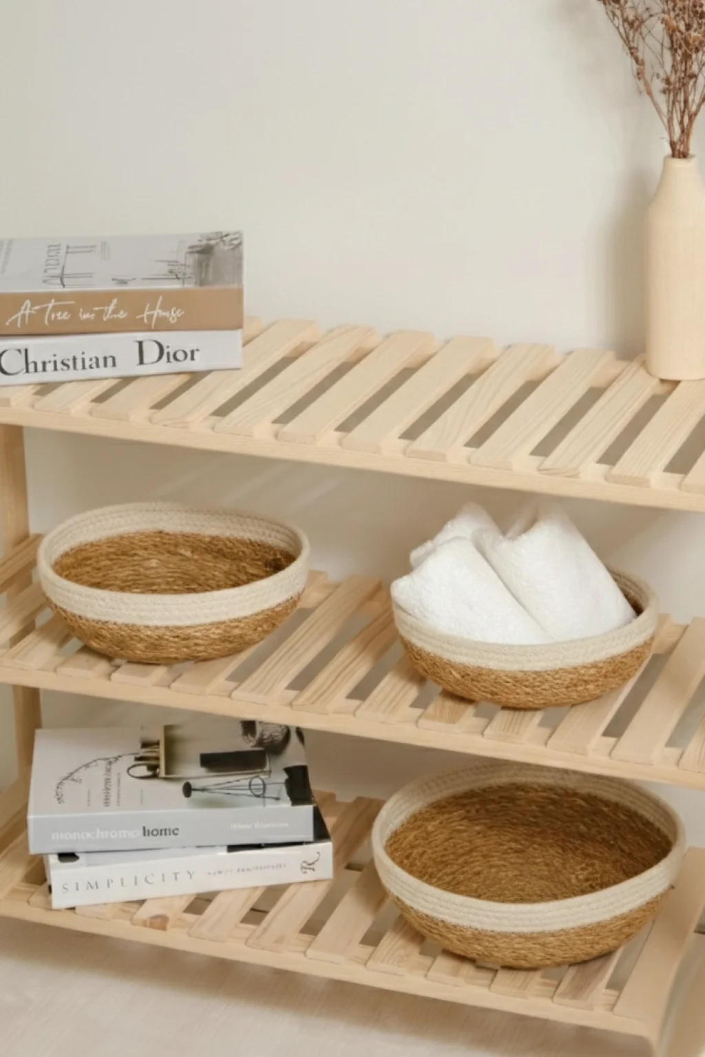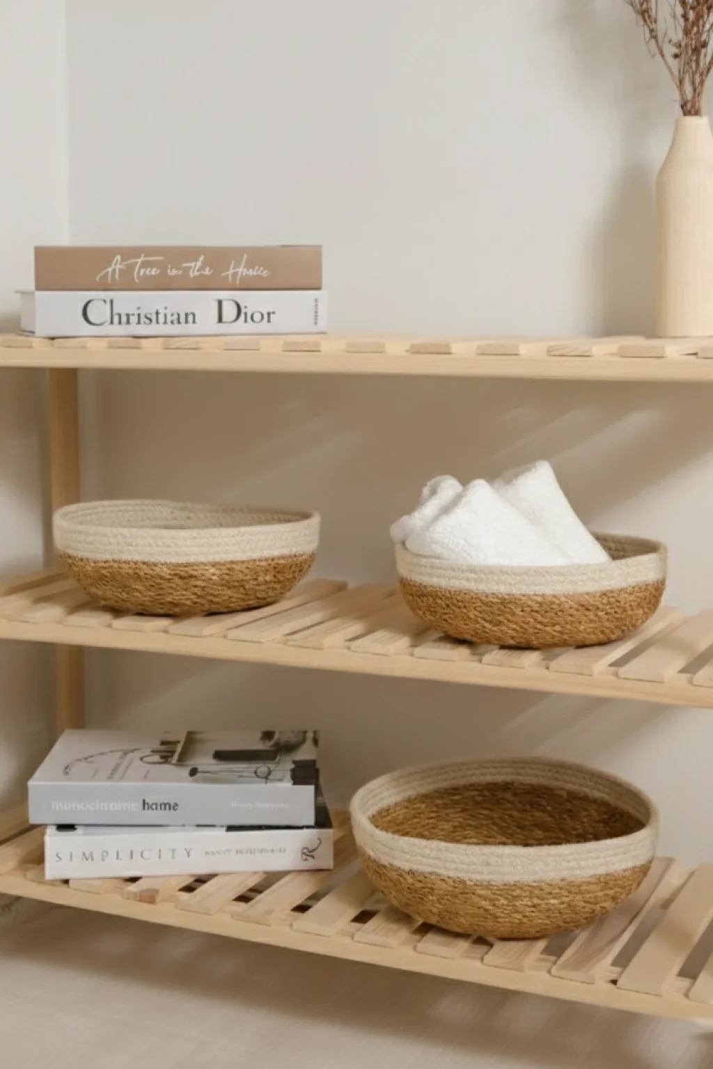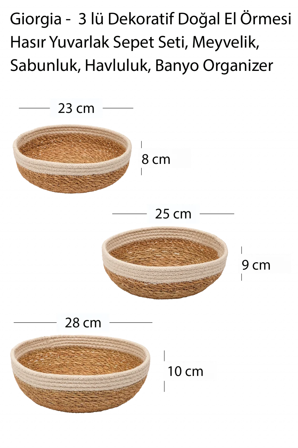 Giorgia - 3 lü Dekoratif Doğal El Örmesi Hasır Yuvarlak Sepet Seti, Meyvelik, Sabunluk, Havluluk, Banyo Organizer