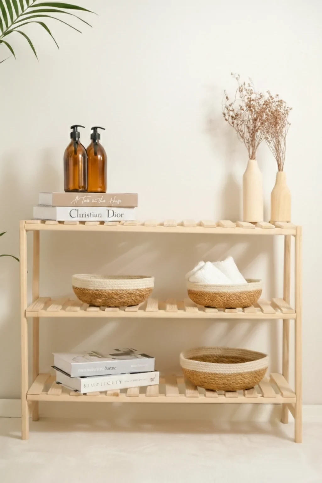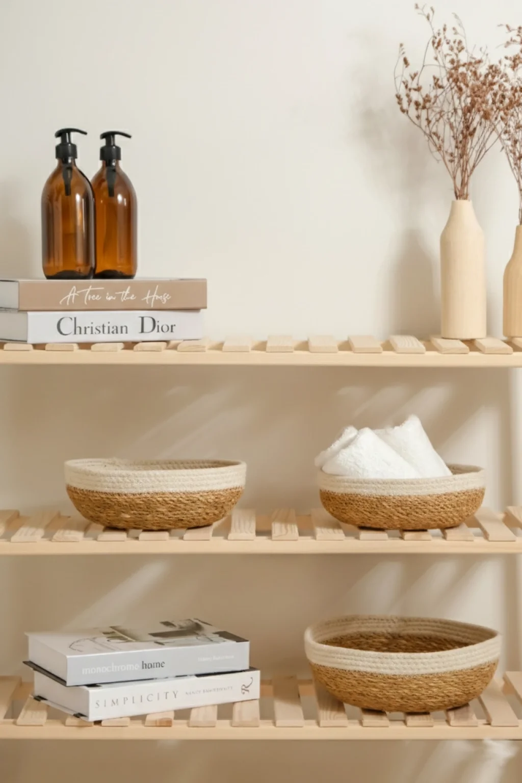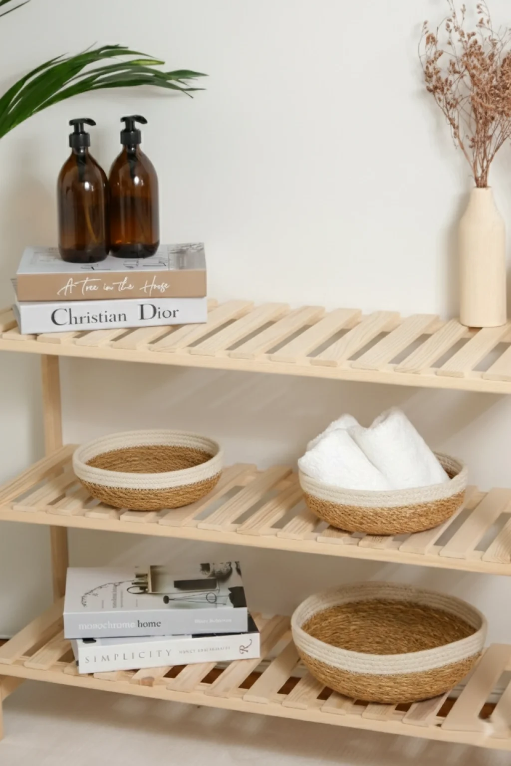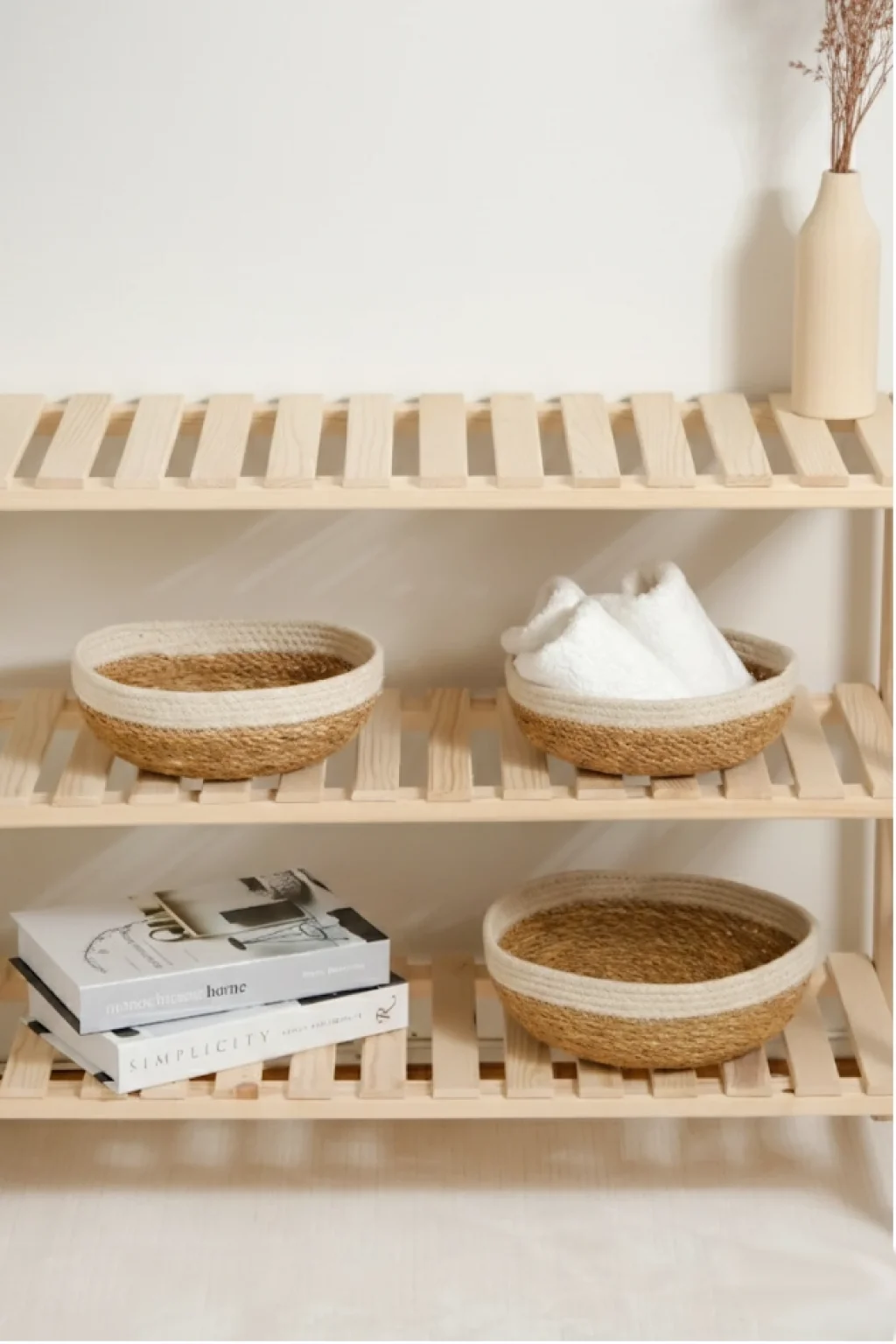 Giorgia - 3 lü Dekoratif Doğal El Örmesi Hasır Yuvarlak Sepet Seti, Meyvelik, Sabunluk, Havluluk, Banyo Organizer
