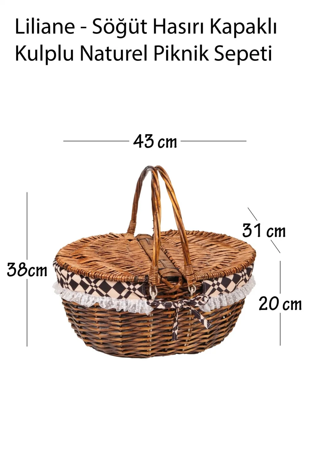 Liliane - Söğüt Hasırı Kapaklı Kulplu İç Korumalı Naturel Piknik Sepeti ; Liliane'nın hasırı doğal ortamlarında, doğal yollardan toplanmakta, mükemmel görüntü adına herhangi bir işleme tabi tutulmadan veya sabit ölçü elde etmek adına her hangi bir kalıp kullanılmadan el işçiliği ile üretilmektedir.; ; Bitkilerin doğal halleri gereği bazı noktalarında renk farklılıkları, renk geçişleri, lekeler ve bitkinin gövdesinde var olan çeşitli farklılıklar ürüne de olduğu gibi yansımakta buda ürünü eşşis yapmaktadır.; ; El yapımı ürünlerin, ölçülerinde çok küçük ölçülerde artı/eksi farklar söz konusu olabilir.; ; Ürünümüz Doğal söğüt hasırından el işçiliği ile yapılmıştır.; ; Sağlam ve tok duruşu ile evlerinize sıcaklık ve çok yönlü dekorasyon özelliği sunar.; ; Herbiri elde üretildiği için kendine özgü ve farklılık gösterir.; ; Nemli bir bez ile silinerek temizlenmelidir.; ; Materyal : Söğüt Hasırı, Yıkanabilir iç bezi Ebatlar En: 43 cm Boy: 31 cm Yükseklik: 20 cm Kulplu Yükseklik (Kulp Dahil): 38 cm ; Koşulları: Ürünlerinizin tarafınıza ulaştığı şekilde patpata sarılı, kutulu ve ambalajı bozulmamış olarak edilmesi gerekmektedir.; Aksi halde gönderilen iadeler kabul edilemeyecektir.; ;