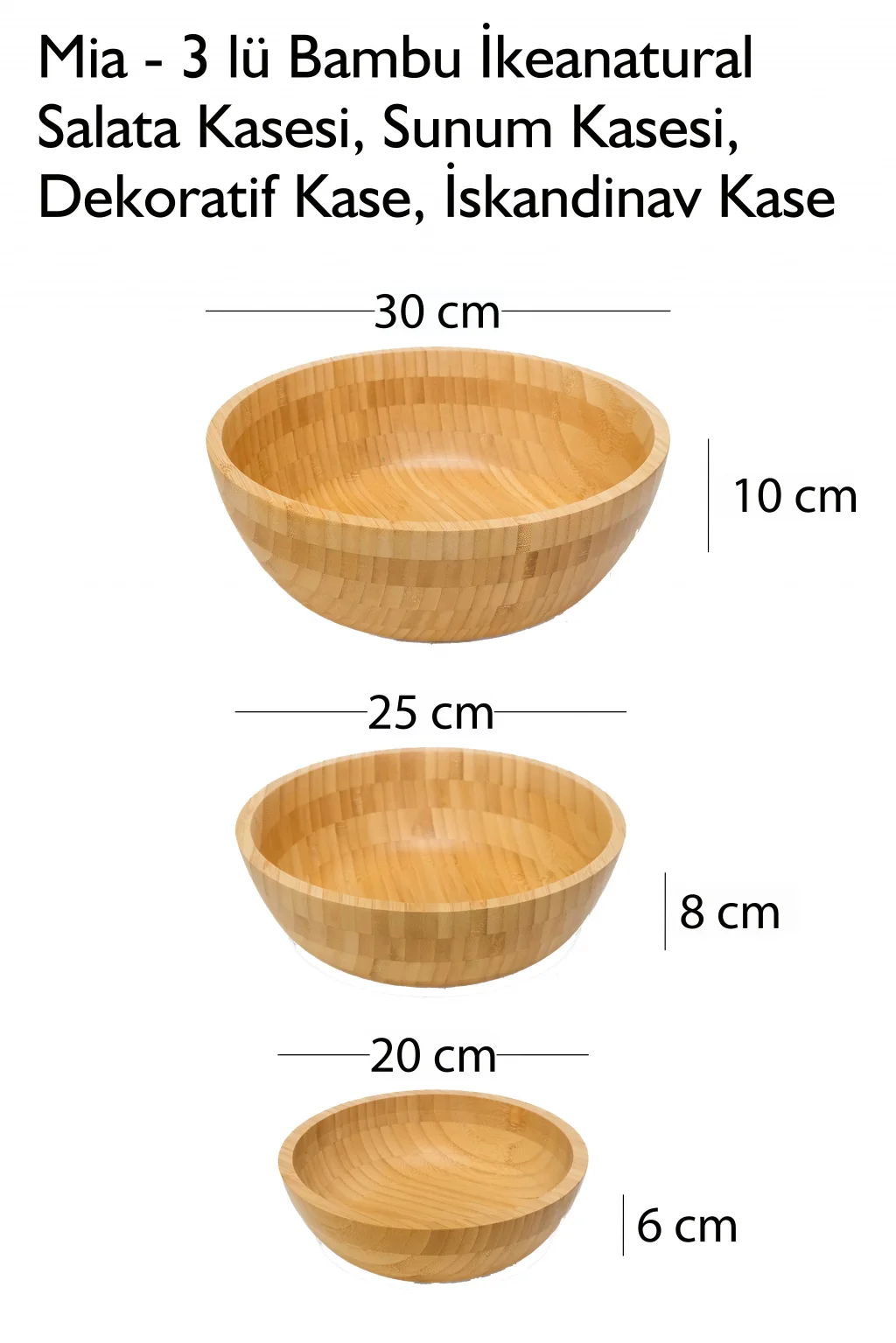 • Mia - 3 lü Bambu İkeanatural Salata Kasesi, Sunum Kasesi, Dekoratif Kase, İskandinav Kase